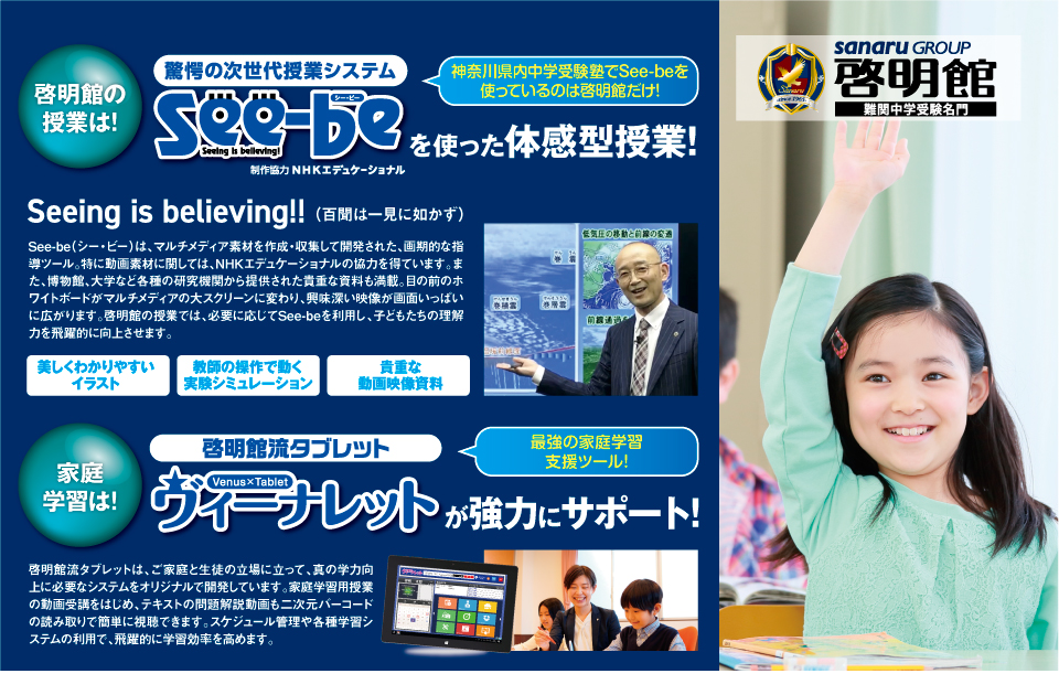 大切なお子さんをお預かりする学びの場だからこそ、啓明館の指導方針をしっかりとご理解いただき、お子さんの将来についてじっくりとご検討いただきたいと考えています。当日は、See-beを使った授業体験に加え、啓明館オリジナルタブレット「ヴィーナレット」の実演も行います。実際の授業で使用する教材もご覧いただけますので、ぜひ親子でご参加ください。